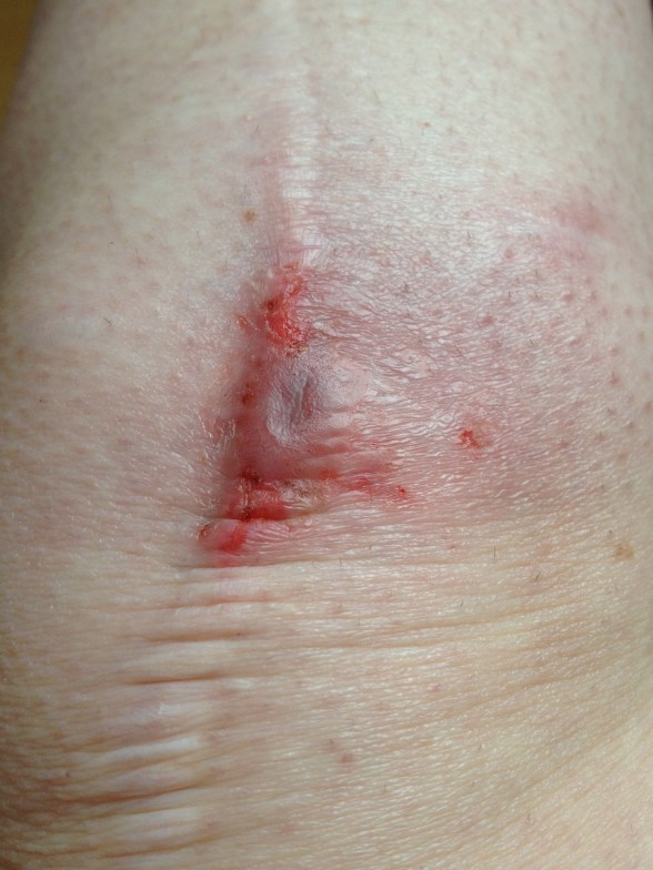 Yesterday I was back at the Doctors to see where we are with the knee infection. From the picture some people may think it looks worse but to me it is much better. The redness is subsiding and it isn’t getting as hot for as long as it has before. I knew the skin would break down where the infection had been under it because it did this with the other knee. I’ve still been applying lashings of Dermol 500 cream to try and stop the flaking, which seems to be working. There is still a small lump, which is hard but I think that is shrinking too.