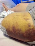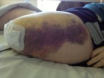 I had been trying to sit up and then lay down again, to try and begin to sit up for longer periods of time, as I kept feeling sick, hot etc. My blood pressure was still low although the heart rate seemed to be slower now. The pain in the stump was also stopping me from sitting too upright, pain and pressure, the further I tried to sit forward the more the stump felt like it was going to explode. Dad took some photos of the stump and it’s bruising, the likes of which I’ve never had before, that’s Liposuction for you.